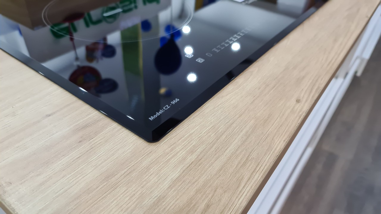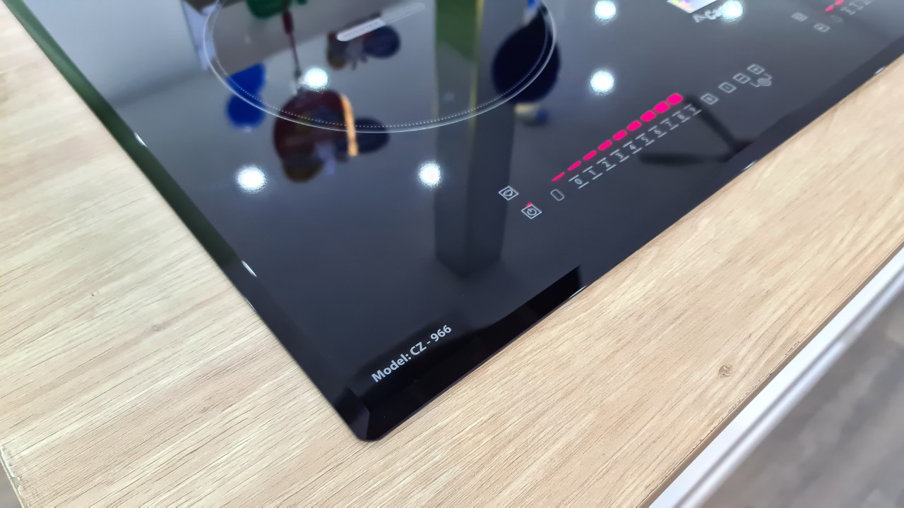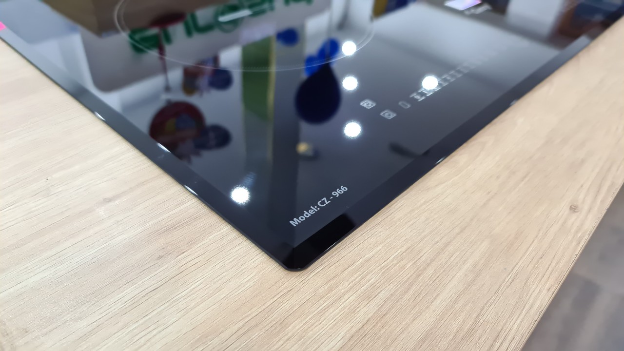 Mặt kính vát cạnh tuyệt đẹp: Mặt kính của bếp Canzy CZ-966 được vát cạnh trước và sau, tăng độ thẩm mỹ cho sản phẩm và tiện lợi khi lau chùi.