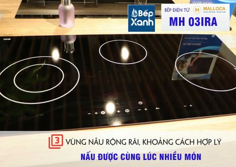 Bếp điện từ Malloca MH-03IRA sở hữu 3 vùng nấu được thiết kế hợp lý, trong đó bao gồm 2 vùng nấu điện và 1 vùng nấu từ, mỗi vùng nấu tương ứng với các mức công suất khác nhau, phù hợp với từng nhu cầu sử dụng của người dùng. Bề mặt kính EuroKera trơn, phẳng dễ dàng vệ sinh và lau chùi sau khi sử dụng.