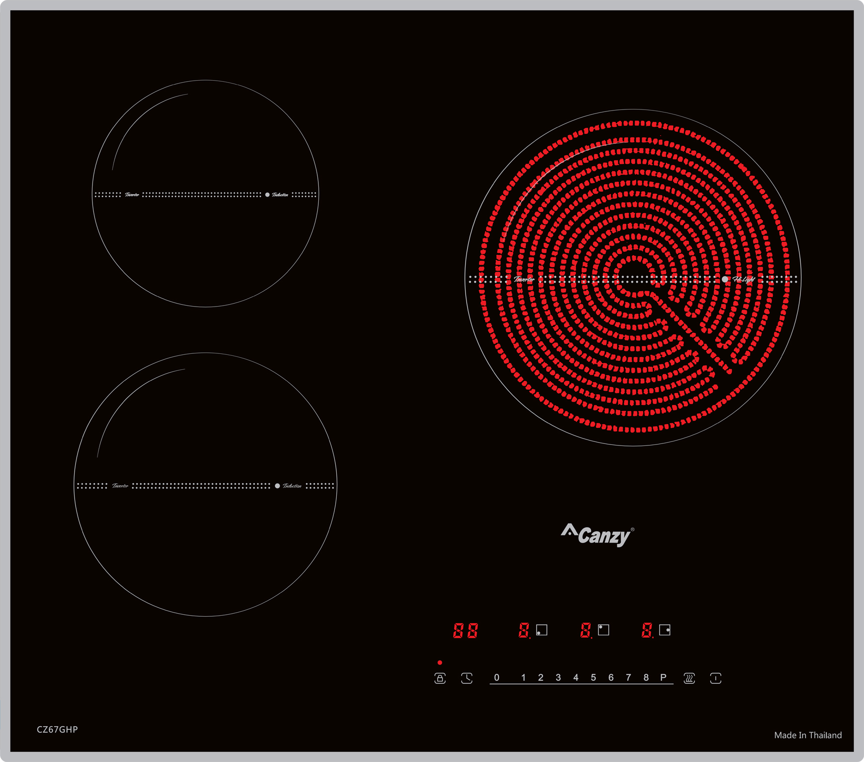 Bếp điện từ Canzy CZ-67GHP gồm 3 vùng nấu, 1 vùng nấu từ lớn có khả năng đun nấu siêu nhanh và tiết kiệm điện năng với công suất Booster 2200W, 1 vùng nấu từ nhỏ có khả năng đun nấu siêu nhanh và tiết kiệm điện năng với công suất Booster 2200W và 1 vùng nấu hồng ngoại sử dụng mâm nhiệt EGO 3 vòng nhiệt với vòng nấu nhỏ bên bếp hồng ngoại có công suất 2400W.