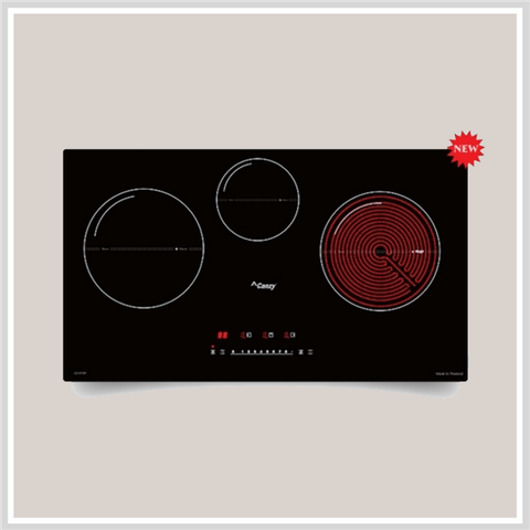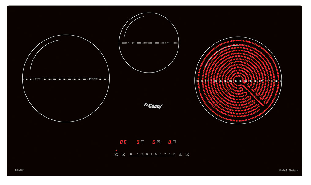 Bếp điện từ Canzy CZ-67GP gồm 3 vùng nấu, 1 vùng nấu từ lớn có khả năng đun nấu siêu nhanh và tiết kiệm điện năng với công suất Booster 2400W, 1 vùng nấu từ nhỏ có khả năng đun nấu siêu nhanh và tiết kiệm điện năng với công suất Booster 1800W và 1 vùng nấu hồng ngoại sử dụng mâm nhiệt EGO 3 vòng nhiệt với vòng nấu nhỏ bên bếp hồng ngoại có công suất 2400W.