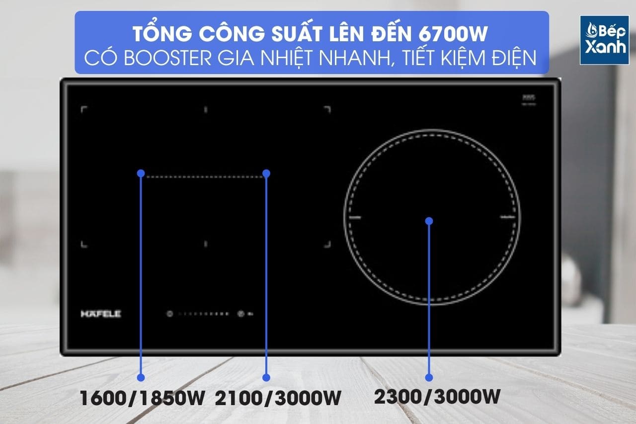 Bếp từ Hafele HC-IF77A 536.61.555 hoạt động với bếp trái 1600W/1850W, bếp giữa 2100W/3000W và vùng bếp tròn 2300W/3000W giúp nấu chín 3 món ăn cùng lúc nhanh chóng, tiện lợi.