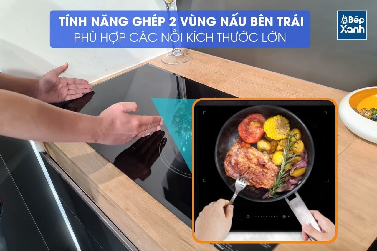 Hai vùng nấu bên trái của Bếp từ Hafele HC-IF77A có thể kết hợp 2 vùng nấu nhỏ thành một vùng nấu lớn, hỗ trợ khi nấu các nồi có kích thước lớn mà không cần phải nấu 2 bếp.