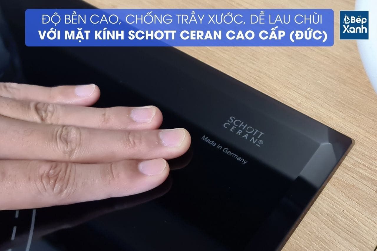 Mặt bếp làm bằng kính Schott Ceran có khả năng chịu lực cao, mặt kính rất bền, chống trầy xước và va đập mạnh, dễ chùi rửa. Đặc biệt có khả năng kháng sốc nhiệt lên đến 800ºC.