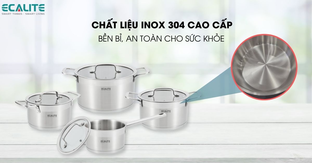 Thương hiệu Ecalite đã lựa chọn chất liệu inox 304 để làm nên bộ nồi 8 món ERW-SA4080. Chất liệu có đặc tính chống oxy hóa, chống gỉ và có tính chống ăn mòn cao, đảm bảo an toàn tuyệt đối cho sức khỏe của gia đình bạn.