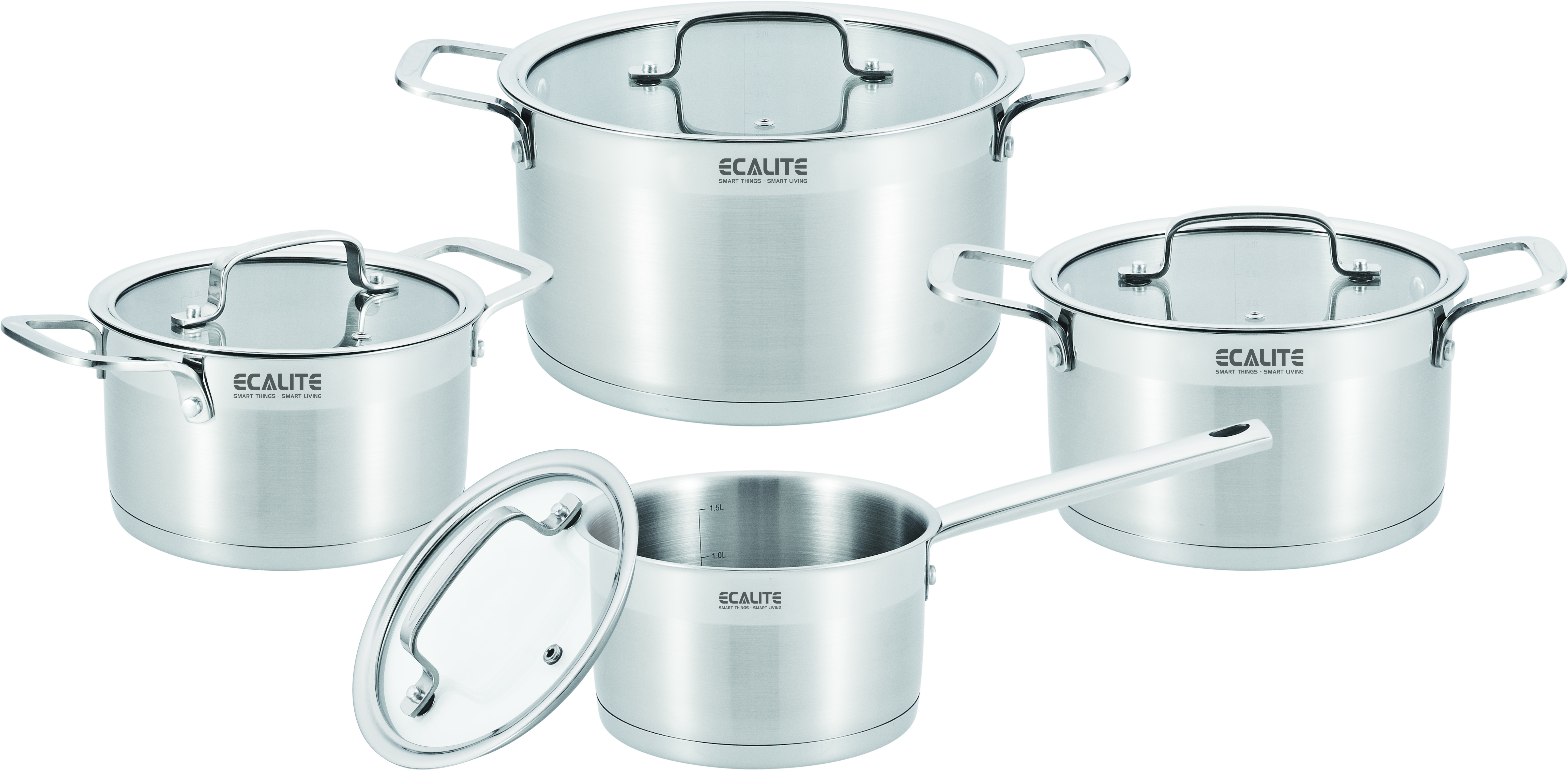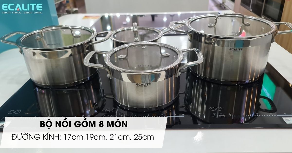 Bộ nồi inox cao cấp Ecalite ERW-SA4080 gồm 8 món: 3 nồi, 1 quánh và 4 nắp. Nồi có kích thước từ nhỏ đến lớn với đường kính lần lượt là: 19cm, 21cm, 25cm và 1 quánh có đường kính 17cm.