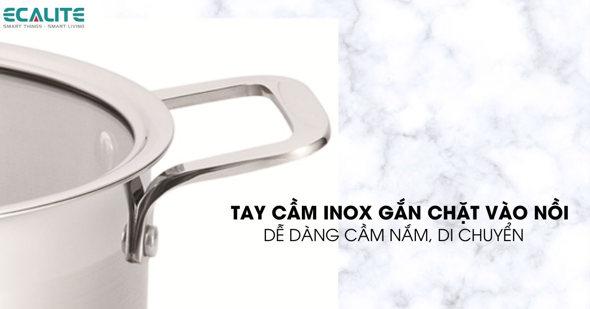 Trang bị quai cầm bằng inox được gắn chặt vào thân nồi tạo cảm giác chắc chắn để khi cầm nắm và di chuyển không sợ bị rớt. Tay cầm có đinh tán chắc chắn chịu lực, chịu nhiệt tốt. Đặc biệt, quai cầm được thiết kế cách điệu tạo nên vẻ đẹp tinh tế cho sản phẩm.