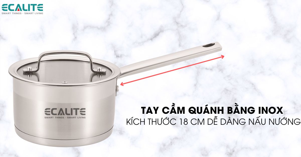 Ngoài ra, quánh được thiết kế tay cầm dài với kích thước 18 cm vừa đủ độ dài để người dùng có thể cầm nắm trong quá trình nấu nướng. Đồng thời, mang đến vẻ đẹp hài hòa cho tổng quan sản phẩm.