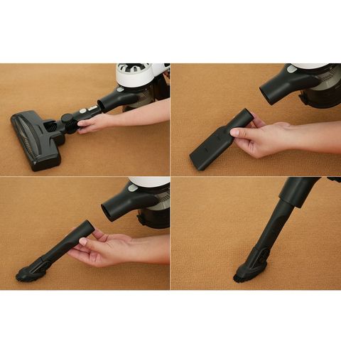 - Trang bị 6 loại đầu hút: đầu hút sàn, đầu hút 2 trong 1, đầu hút bàn chải, đầu hút giường, đầu hút lông thú và đầu hút đệm, có thể tiếp cận mọi khu vực trong nhà bạn, từ bên dưới gầm sofa đến các vị trí trên cao. Chỉ cần gắn phụ kiện phù hợp với bề mặt và vị trí bạn cần làm sạch. Khi hoàn thành công việc, bạn có thể treo máy trên giá treo tường đi kèm một cách thuận tiện và nhanh chóng, trong đó: