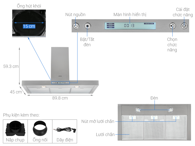 Dễ quan sát, tiện tắt/mở máy, tắt/mở đèn, điều chỉnh các tốc độ, hẹn giờ hút phù hợp với nhu cầu.
