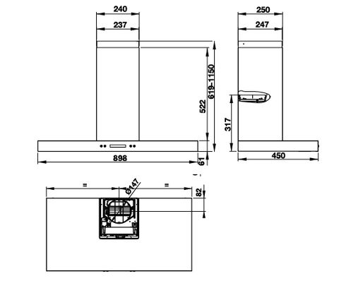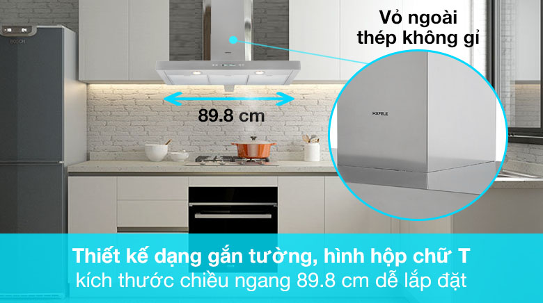 Máy khử mùi áp tường có chiều ngang 89.8 cm phù hợp dùng trong căn hộ, biệt thự cao cấp có diện tích bếp rộng rãi, không bị giới hạn về chiều ngang.