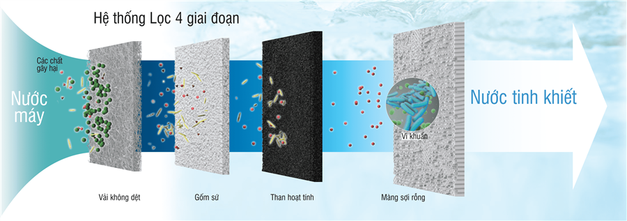 Nước máy đầu vào sẽ được lọc bằng hệ thống làm sạch 4 tầng, công suất cao của Panasonic. Bộ lọc này được làm từ 4 vật liệu đặc biệt sẽ giúp: