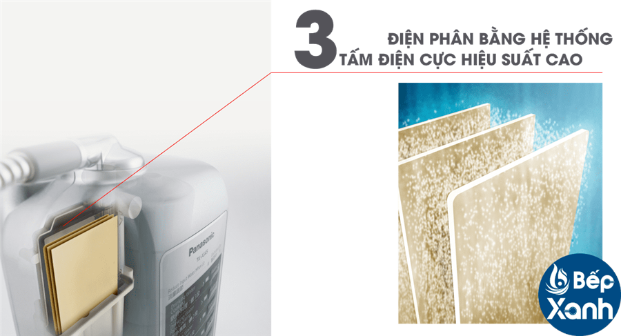Nước đầu vào sau khi được lọc sạch sẽ vào buồng điện phân công suất cao với 5 tấm điện cực để phân tách các phân tử nước và tái cấu trúc các phân tử nước, nước ION KIỀM được sản sinh ở cực âm, nước ION AXIT (nước có tính axit) sẽ được sản sinh ở cực dương.