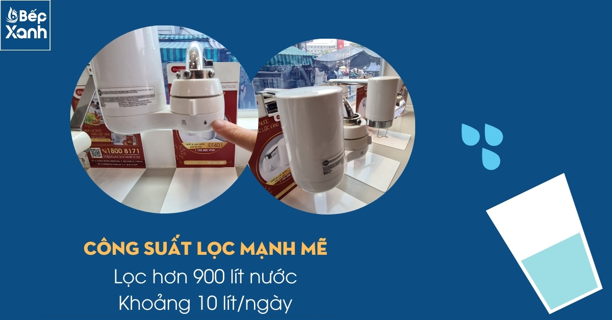 Mitsubishi Cleansui.Máy lọc nước lắp tại vòi Mitsubishi Cleansui EF401: Bộ lọc nước được gắn trên vòi, kích thước 124 x 129 x 74 mm, trọng lượng nhẹ khoảng 330 gram, giúp nước khi uống không còn Clo, hoàn toàn tự nhiên và sạch. Cho phép bạn sử dụng nước một cách tự tin. Thuận tiện và nhanh chóng cả sử dụng và cài đặt: bạn chỉ cần xoay nó bên cạnh vòi và có thể sử dụng ngay.