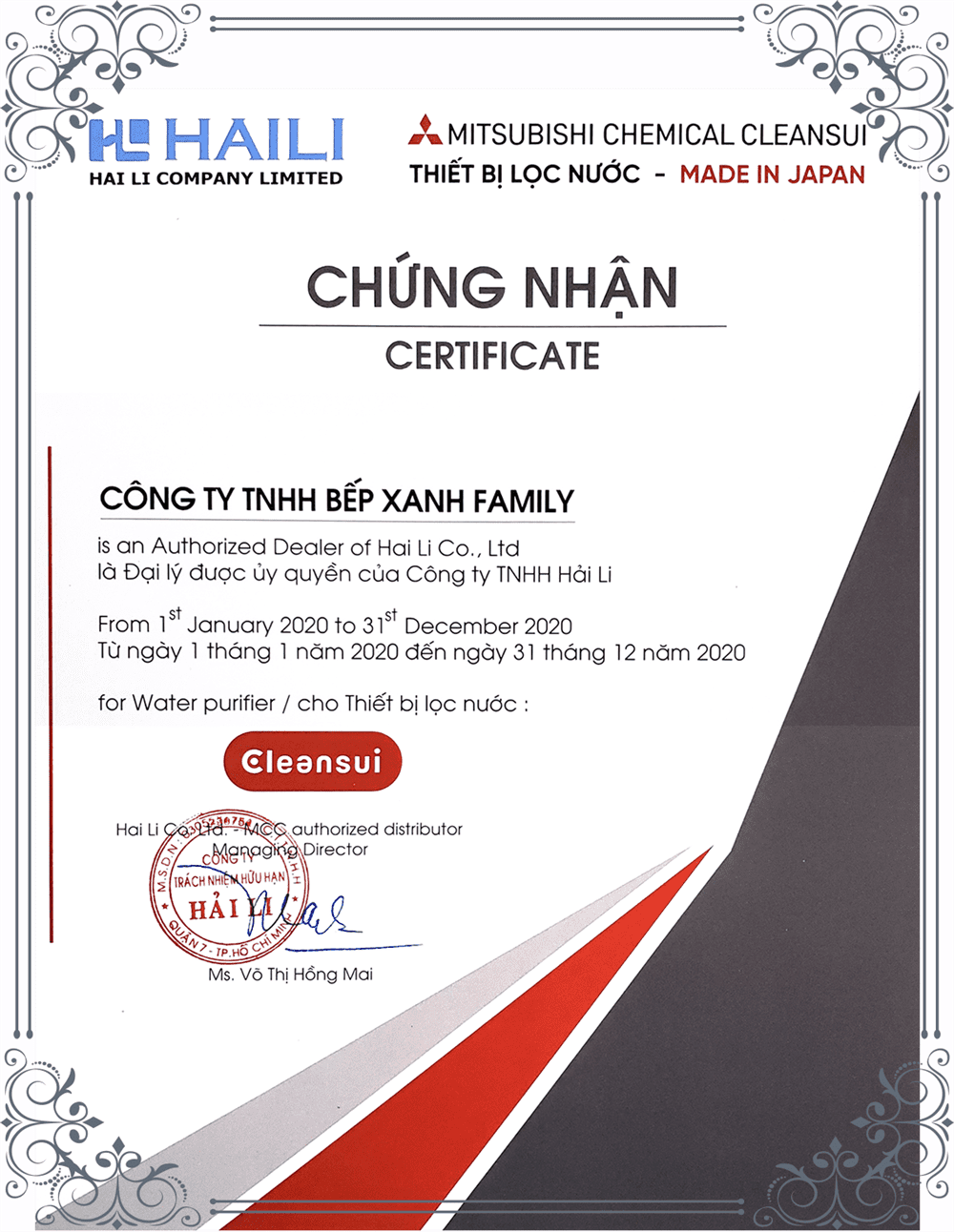 Bếp XANH được công ty TNHH Hải Li (Đại diện duy nhất của Cleansui tại Việt Nam) chứng nhận là đại lý ủy quyền. Đây là giấy chứng nhận, đảm bảo các sản phẩm thiết bị lọc nước Cleansui do Bếp XANH phân phối đều là hàng chính hãng 100%, có hóa đơn VAT rõ ràng, và tuân thủ chính sách bảo hành của hãng tại Việt Nam.