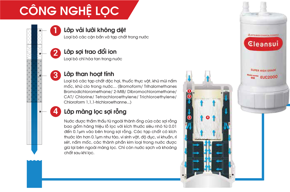 Máy lọc nước Cleansui EU101 sử dụng lõi lọc EUC2000, đây là bộ lọc cao cấp nhất của Cleansui. Với cấu tạo gồm 4 lớp lọc cực kỳ ưu việt: