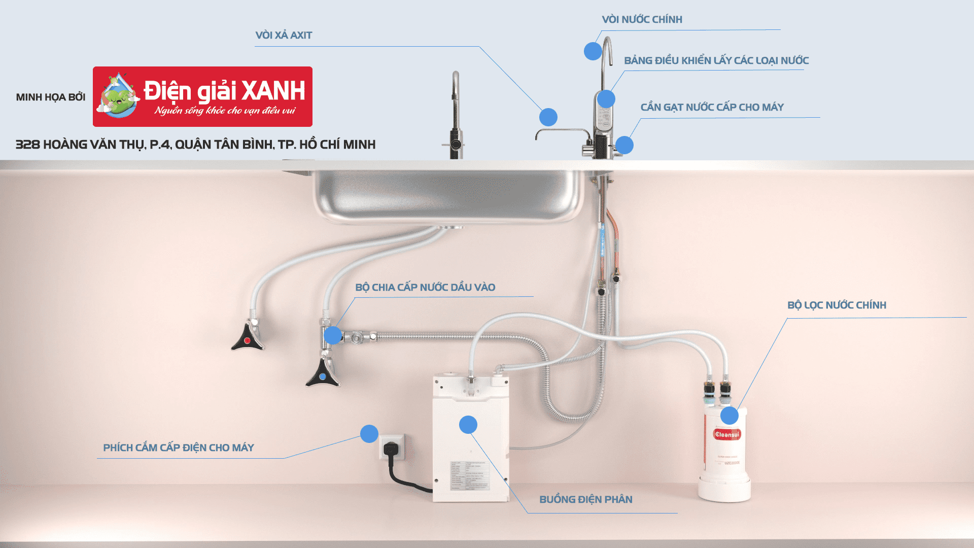 Nước đầu vào sau khi được lọc sạch sẽ vào buồng điện phân công suất cao với 5 tấm điện cực để phân tách các phân tử nước và tái cấu trúc các phân tử nước, nước ION KIỀM được sản sinh ở cực âm, nước ION AXIT (nước có tính axit) sẽ được sản sinh ở cực dương.