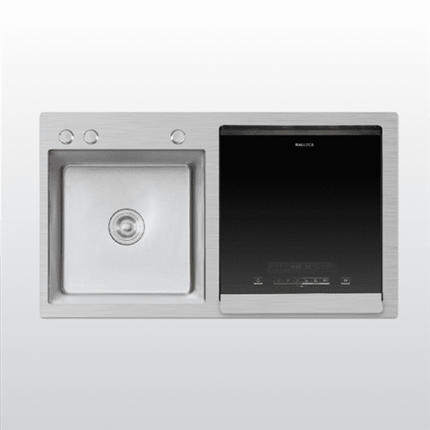 Máy rửa chén tích hợp chậu rửa được hãng Malloca thiết kế nhỏ gọn và tiện lợi, kiểu dáng lắp âm hiện đại giúp tiết kiệm diện tích. Bên trái là hộc chậu rửa được chế tạo bán thủ công với các góc cạnh và bề mặt Inox được xử lý một cách sắc sảo và tinh tế. Ngoài ra chậu rửa chén được trang bị lỗ chờ tiện lợi có thể sử dụng để chứa bình đựng xà bông giúp việc rửa chén được tiết kiệm thời gian hơn cùng với đó là bộ xả rác thông minh ngăn mùi hiệu quả. Bên phải là máy rửa chén được thiết kế bằng mặt kính đen sang trọng. Bảng điều khiển bằng cảm ứng kết hợp với màn hình LCD hiển thị trực quan dễ sử dụng.
