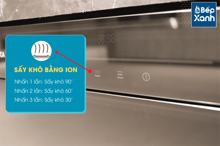 Chức năng sấy gồm 3 lựa chọn, thời gian 90', 60' hoặc 30' tùy vào mức độ chén đĩa.