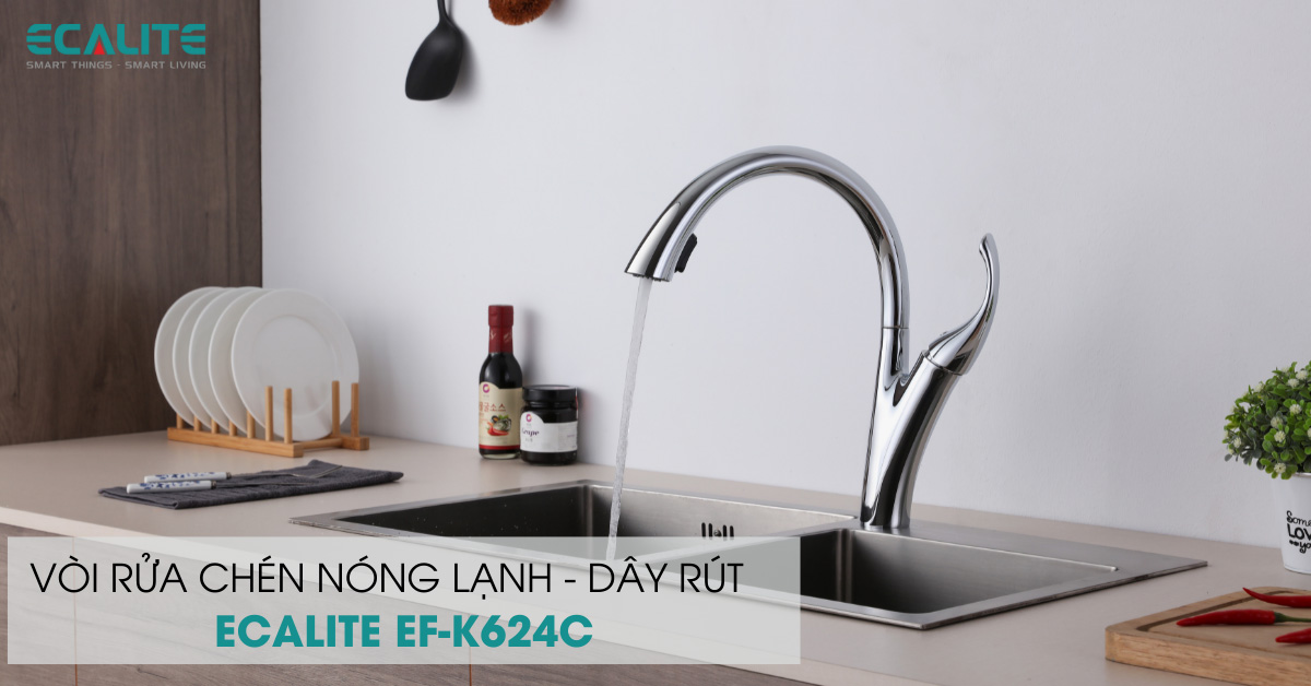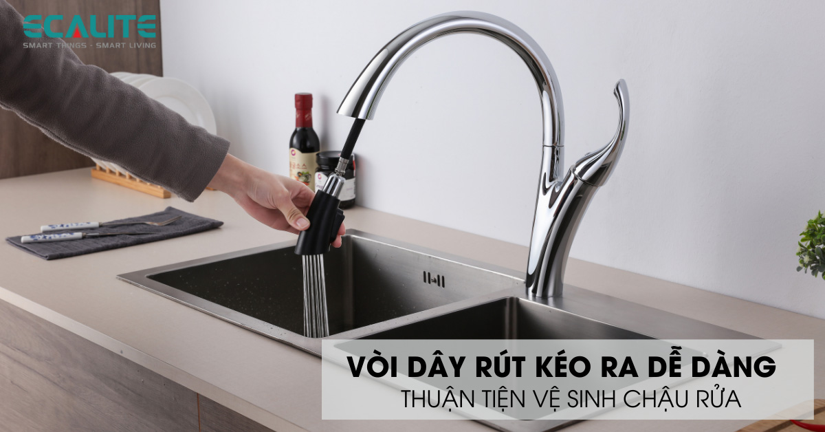 Bên cạnh có 2 đường nước nóng-lạnh thì việc sở hữu thêm dây rút là điểm cộng lớn của vòi rửa EF-K624C. Khi cần sử dụng, bạn chỉ cần kéo nhẹ là đầu vòi sẽ được kéo dài thêm, từ đó bạn có thể di chuyển đầu vòi ở nhiều vị trí cả trong và ngoài chậu để phục vụ nhiều nhu cầu khác nhau, điển hình là vệ sinh các góc của chậu rửa chén vô cùng nhanh chóng. Nhờ thiết kế này, vòi rửa chén dây rút Ecalite EF-K624C phù hợp khi đi kèm với nhiều mẫu chậu như chậu đơn ngăn lớn hoặc chậu đôi.