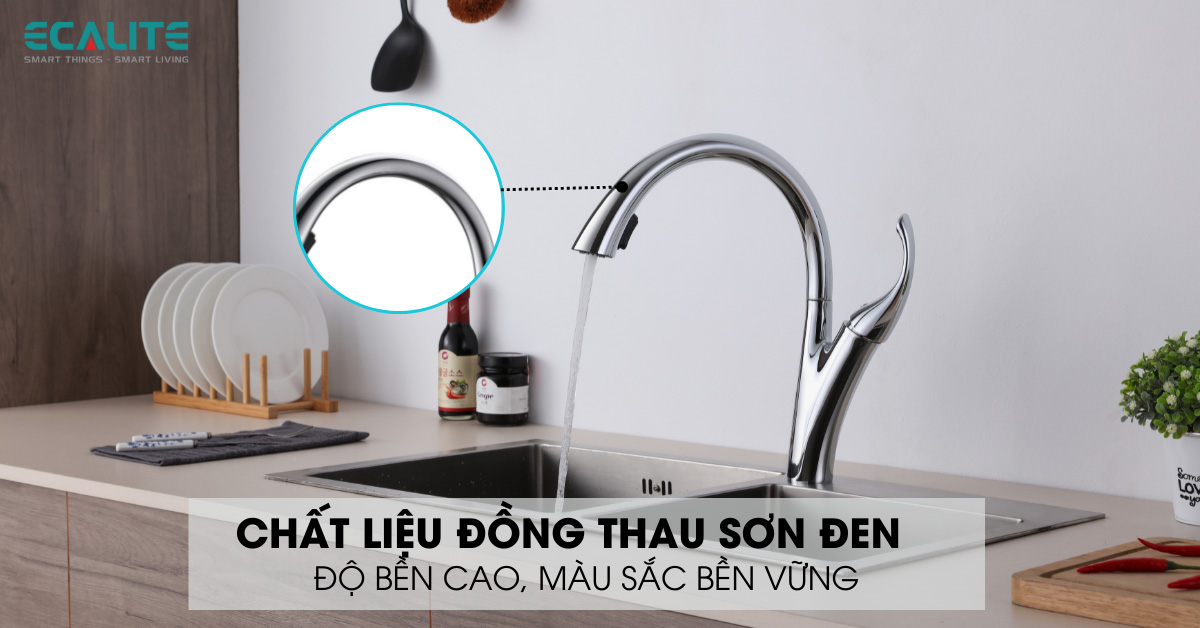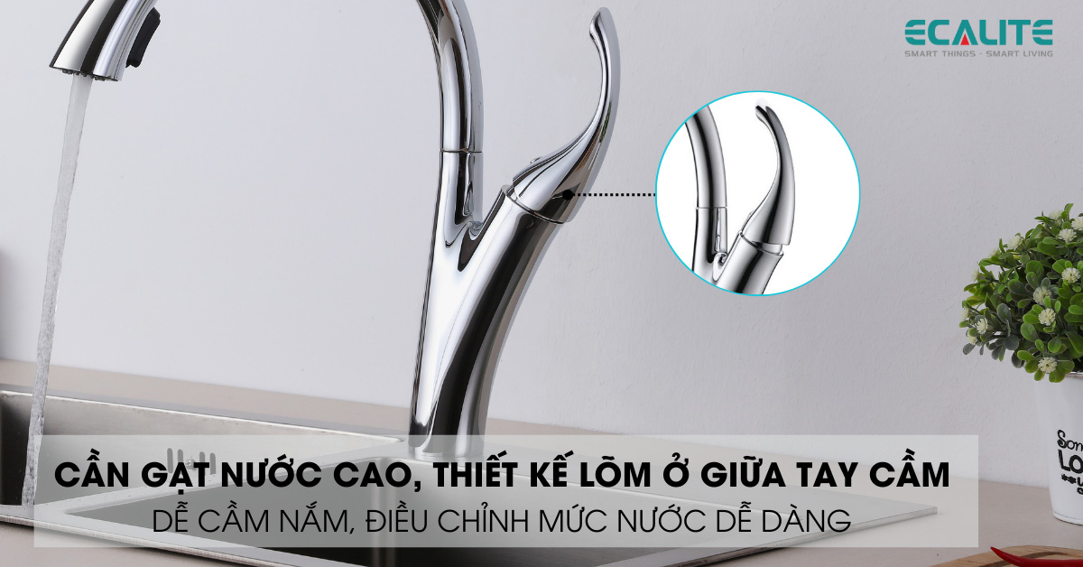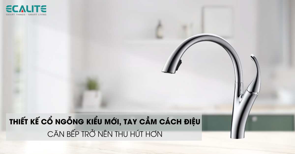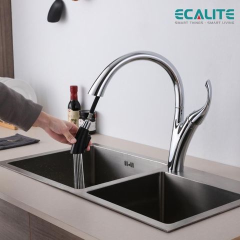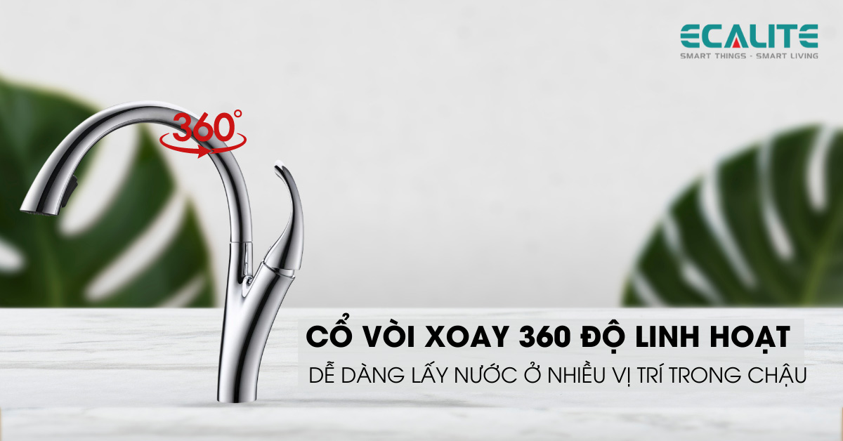 Phần cổ của vòi được Ecalite thiết kế dạng xoay 360 độ, dễ dàng điều chỉnh hướng dòng chảy theo ý muốn. Nhờ đó, bạn có thể rửa thực phẩm và vệ sinh chậu rửa theo nhiều hướng khác nhau thay vì cố định như các dòng vòi rửa chén thông thường.
