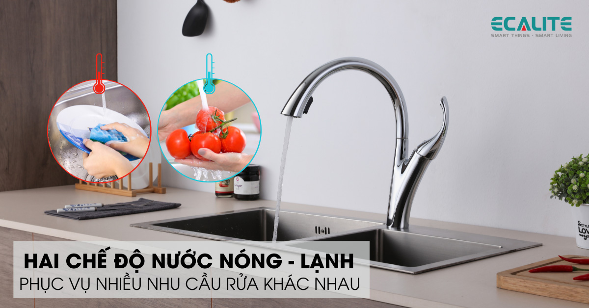 Được trang bị hai nguồn nước nóng - lạnh, vòi rửa chén Ecalitecó thể dễ dàng điều chỉnh nhiệt độ thích hợp với nhu cầu sử dụng. Bạn có thể dùng nước lạnh để rửa rau củ quả, còn nước nóng thì hỗ trợ rửa sạch hơn chén đĩa dính dầu mỡ, hoặc rửa vật dụng cho em bé tiện hơn mà không cần phải chờ đợi đun nước sôi. Mẫu vòi có chức năng nước nóng này đặc biệt phù hợp khi sử dụng vào mùa đông, tránh làm lạnh tay khi sử dụng nước để rửa chén.