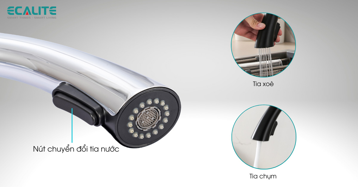 Vòi rửa chén Ecalite EF-K624Cgồm có 2 tia nước khi sử dụng là tia chụm và tia xoè, được chuyển đổi thông qua nút bấm ở đầu vòi. Tuỳ vào nhu cầu sử dụng, bạn có thể chuyển qua lại giữa 2 tia nước rất dễ dàng, từ đó tăng hiệu quả và tiết kiệm nước tối ưu.