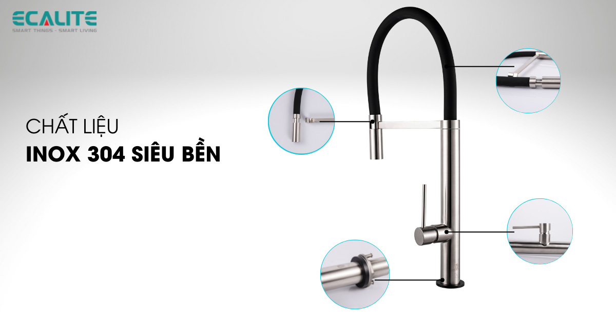 Khác với các sản phẩm vòi rửa chén khác của Ecalite được phủ lên lớp đồng thau hay inox trên toàn bộ thân vòi, phần ống nước EF-K200Si có ưu điểm đặc biệt khi có phần ống dẫn làm bằng chất liệu Silicon cao cấp với đặc tính dẻo có tác dụng chịu nhiệt tốt, đảm bảo an toàn tuyệt đối cho người dùng.